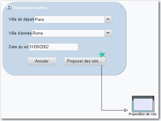 Vous pouvez relier un événement à un élément d'IHM. Dans notre exemple, le bouton « Proposer des vols » est relié à un événement, qui, lorsqu'il est actionné, ouvre une autre interface.