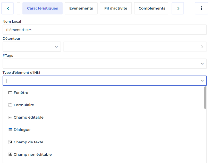 • Ou ouvrez la page de propriétés Caractéristiques de l'événement et renseignez le champ Elément d'IHM.