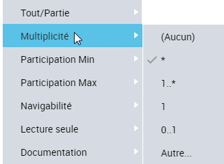 Si le menu affiché ne propose pas les multiplicités, vérifiez que vous avez bien cliqué sur le trait qui matérialise le rôle, et non sur l'association.