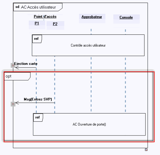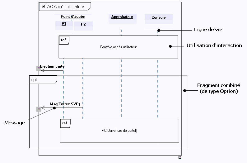 Dans l'exemple ci-dessous, un fragment combiné de type optionnel traduit un comportement susceptible de contrarier le séquencement normal (l'ouverture de la porte).