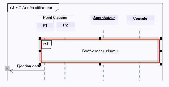 • Deux points d'entrée (représentés par des lignes de vie) donnent lieu à un contrôle d'accès de l'utilisateur. Ce contrôle est décrit dans une interaction.