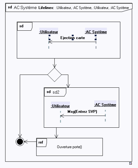 Le diagramme de vue générale d'interaction permet de décrire les enchaînements possibles entre les scénarios préalablement identifiés sous forme de diagrammes de séquences. Il vise à fournir une vue d'ensemble du flux de contrôle.