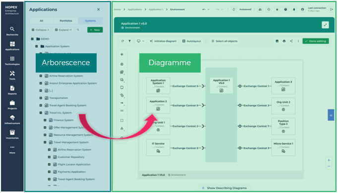6. Les objets sont automatiquement ajoutés au diagramme du côté de l'objet courant que vous avez sélectionné. Les liens entre l'objet courant et les nouveaux objets apparaissent automatiquement.