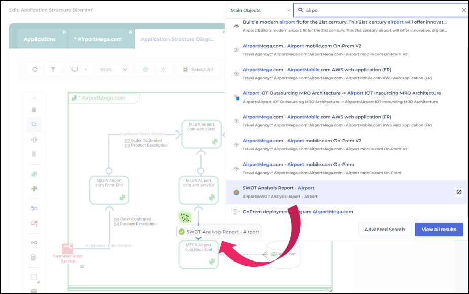 3. Dans la liste des résultats de votre recherche, sélectionnez l'objet qui vous intéresse et effectuez un glisser-déposer de l'objet vers le diagramme.