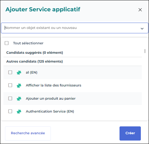 Après avoir sélectionné un type d'objet, vous pouvez sélectionner plusieurs objets du même type à ajouter au diagramme, ou en créer un nouveau. Des Candidats suggérés et d'Autres candidats sont présentés en fonction de leur pertinence dans le contexte du diagramme.
