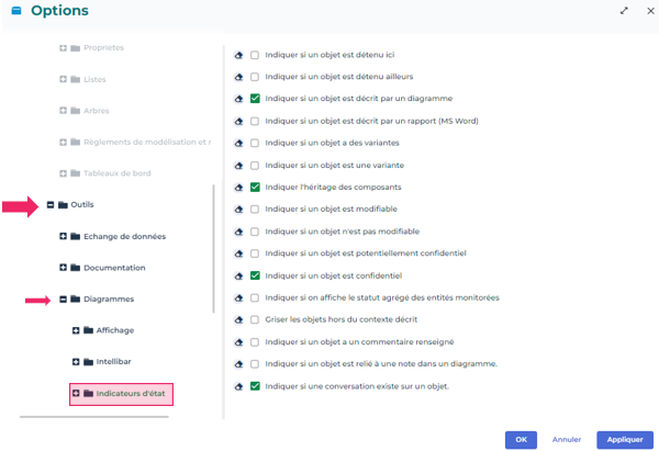 2. Dans l'arbre des options, sélectionnez Outils > Diagrammes > Indicateurs d'état.