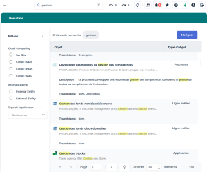 Exemple : les filtres obtenus sur les résultats d'une recherche plein texte sur tous types d'objets qui contiennent "gestion".