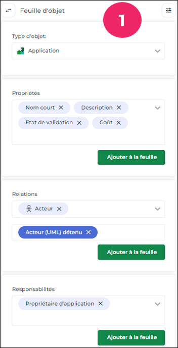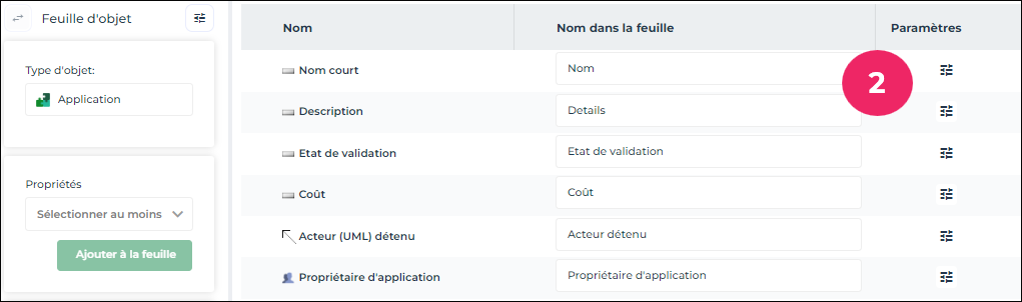 Exemple : paramétrage d'une feuille ayant pour type d'objet Applications