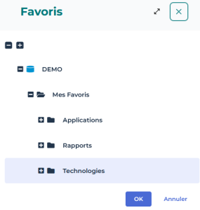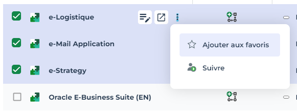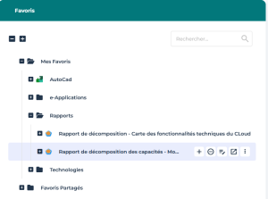 Les favoris fournissent un accès rapide aux objets consultés régulièrement. Ils permettent d'accéder à l'ensemble des actions possibles sur ces objets. Les favoris sont utiles lorsque votre référentiel est volumineux et vous font gagner un temps de navigation précieux.