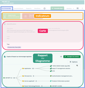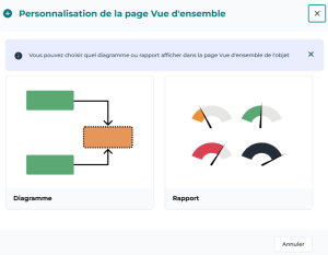 Le profil Administrateur fonctionnel de la Solution permet de changer le contenu (rapport ou diagramme) de la page de propriétés Vue d'ensemble.
