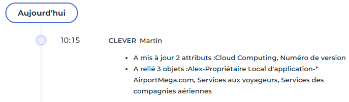 Ex. : un utilisateur a effectué plusieurs modifications sur un objet entre 10:00 et 11:00. Ses modifications sont regroupées dans un même élément d'activité à 10:15 (heure de la dernière modification).