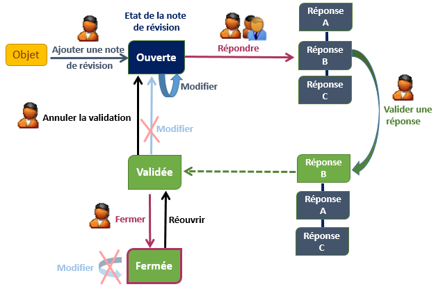 Le schéma suivant présente les actions liées aux états d'une note de révision et les éléments qui participent aux notes de révision.