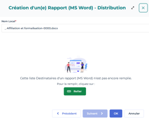7. Renseignez les destinataires du rapport MS Word : cliquez sur Relier et sélectionnez des Acteurs et/ou des Personnes.
