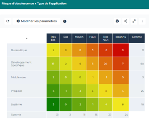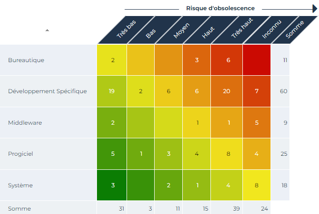 Ci-après la carte de chaleur présente le risque d'obsolescence (Très bas, Bas, etc.) d'une liste d'applications en fonction de leur type (Bureautique, Système, etc.).
