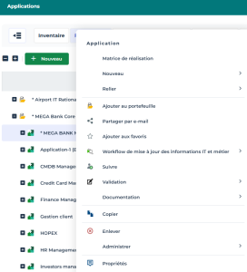Exemple : le menu contextuel d'une application dans une arborescence, avec le profil Administrateur Fonctionnel EA.