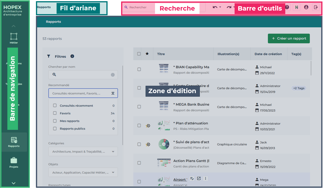 • d'une barre d'outils (commune à tous les bureaux Hopex) en haut à droite, qui inclut la recherche