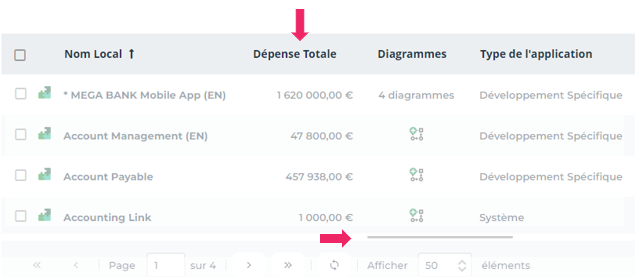 Vous pouvez, par exemple, placer la colonne Dépense Totale directement après Nom Local pour pouvoir la conserver affichée quand vous consultez les autres colonnes. Le curseur de défilement est positionné sous la première colonne après Dépense Totale.