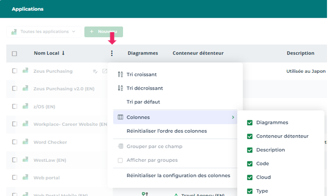 Dans les listes, vous pouvez configurer l'affichage des colonnes et des données.