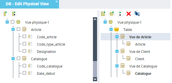 Le navigateur de gauche affiche les tables de la base de données sur lesquelles porte la vue physique, avec leurs colonnes. L'arbre de droite affiche les tables et les colonnes de vue, qui constituent la vue. Par défaut, celles-ci portent le nom des tables et colonnes sources ; vous pouvez les renommer.