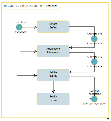 Par exemple, une "Personne", devient visible d'une médiathèque après son "Inscription". Elle peut être inscrit avec l'état de "Enfant", "Adolescent", "Adulte" ou "Senior". Le passage d'un état à un autre peut être lié à un événement, un "Anniversaire", par exemple.