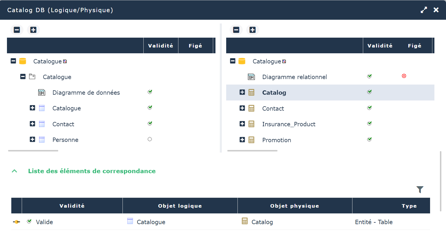 Les objets qui ont une correspondance sont cochés en vert. Lorsque vous sélectionnez l'un de ces objets dans l'arbre de navigation, sa correspondance apparaît dans la fenêtre de détails située par défaut en bas de l'éditeur de correspondances. Elle regroupe le nom des objets reliés, le type des objets et éventuellement un commentaire.