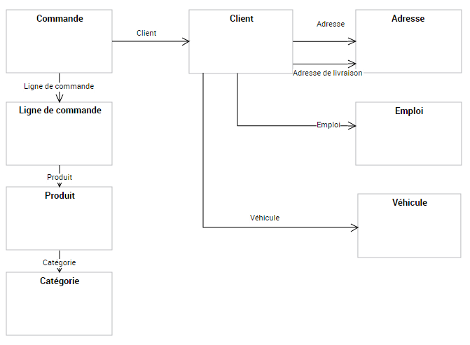 Le diagramme de domaine de données suivant représente une structure de données relative aux Commandes ; il décrit sous forme de tout/partie les classes et leurs relations.