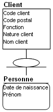 Dans l'exemple ci-dessus, certains attributs ont un intérêt pour les personnes et n'ont pas de sens pour d'autres catégories de clients. Personne est une entité dépendante représentée par une boîte aux angles arrondis.