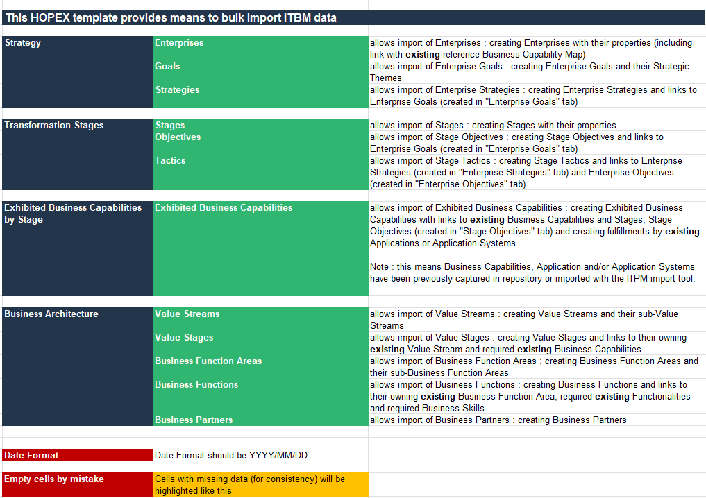 Hopex IT Business Management fournit un modèle de fichier Excel pour importer en masse des objets dans le référentiel HOPEX.
