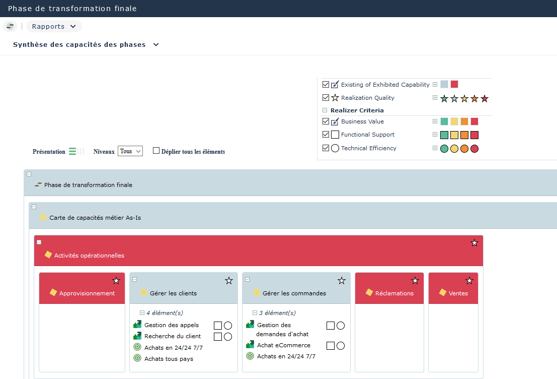 Ce rapport est disponible à partir de page de propriétés Rapport d'une phase de transformation. Il présente une vue des capacités métier de l'entreprise en mettant en évidence les capacités métier exposées.