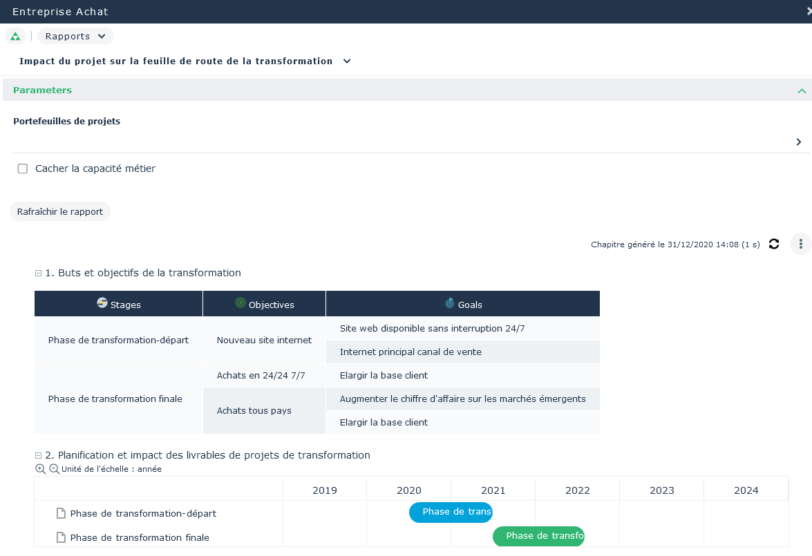 La feuille de route de la transformation se présente sous la forme de rapports accessible depuis l'entreprise.