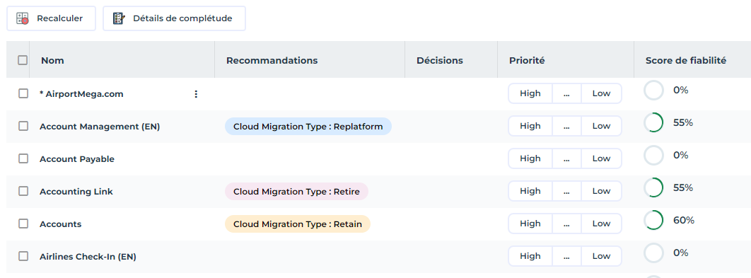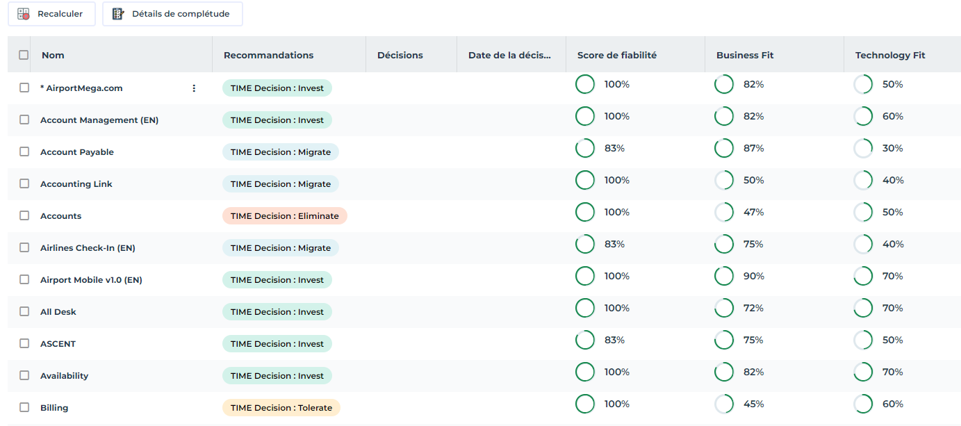 Les analyses TIME Analysis et Cloud Migration Analysis portent sur un portefeuille d'applications. Elles présentent, pour chaque application du portefeuille, les valeurs d'indicateurs agrégés, ainsi que la recommandation de décision, lorsqu'elle est disponible.