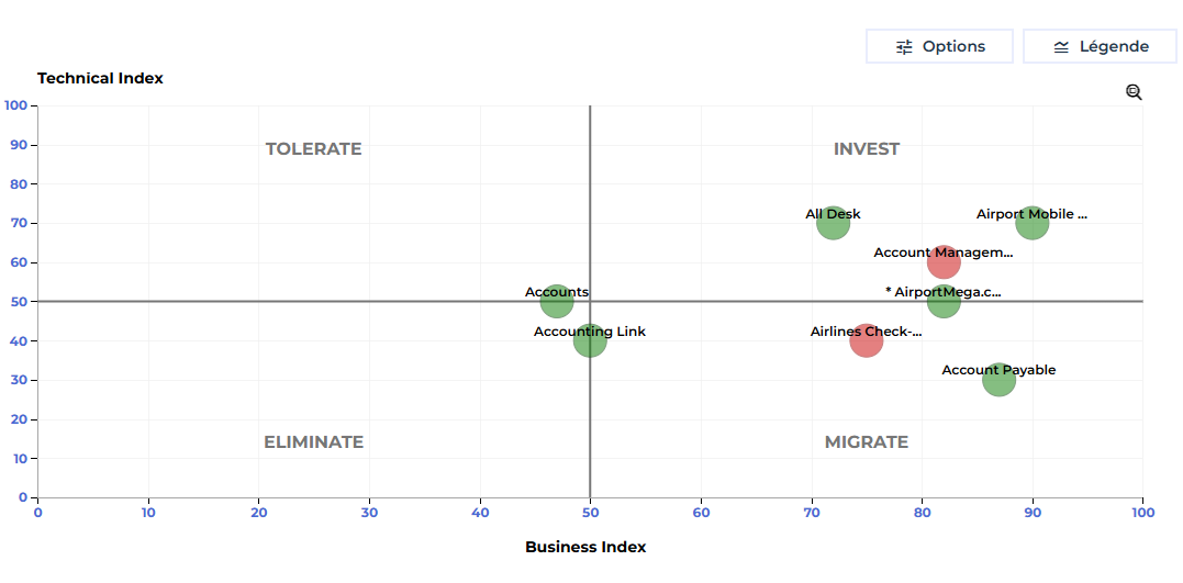 • "Eliminate" : applications qui ont une faible valeur commerciale, voire des risques élevés. Elles doivent être éliminées.