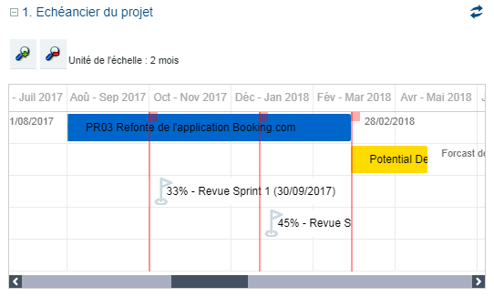L'avancement du projet et les délais prévisionnels déclarés lors du suivi d'exécution du projet sont également reportés sur le graphe.