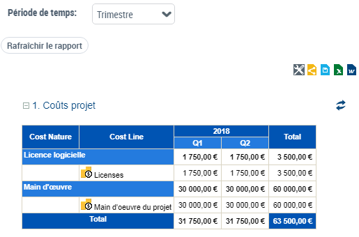 Il est possible de paramétrer la période de consolidation des coûts via le paramètre Période de temps ; par exemple un sous-total des coûts projet est possible par trimestre.