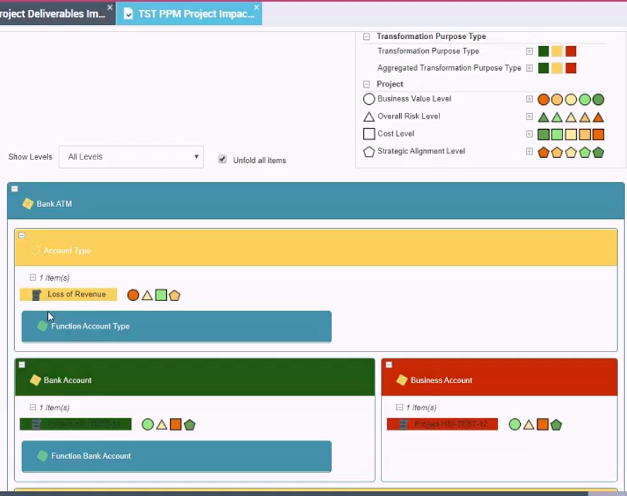 • Activer le critère Type d'objectif : vous pouvez afficher ou cacher le type d'objectif des projets. Cette option est activée par défaut, avec la forme "Fill color" : une couleur surligne les capacités et les projets du rapport en fonction du type d'objectif des projets.