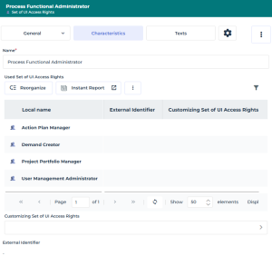For example the "Process Functional Administrator" Set of UI access rights (of the Process Functional Administrator profile) inherits from the permissions defined on the "Action Plan Manager", "Demand Creator", "Project Portfolio Manager", and "User Management Administrator" Sets of UI access rights.