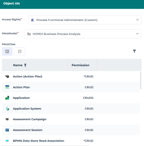 <HOPEX Default> defines default access permissions of each MetaClass, MetaAttribute, MetaAssociationEnd and tool.
