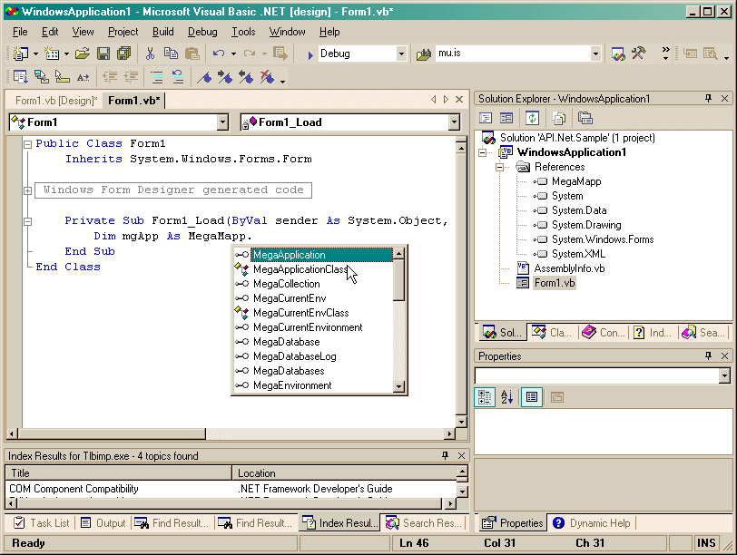 To ensure total integration of the MEGA API component, Visual.NET automatically creates an intermediate .NET DLL. The role of this intermediate dll (interop.MegaMapp.dll) is to encapsulate each COM object exported and to handle its life cycle. From the user point of view, the operation is transparent and it can use objects of the API like any other .NET object.