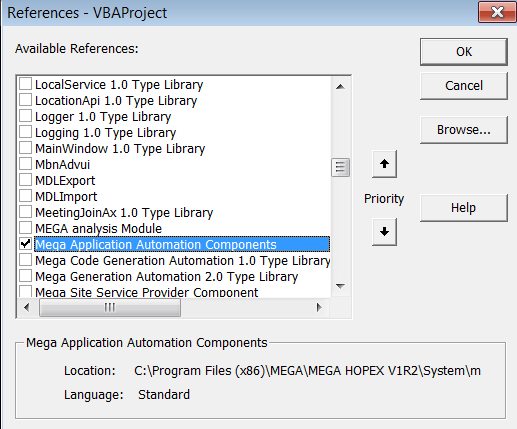 2. In the VBAProject References dialog box, select the Mega Application Automation Components component.
