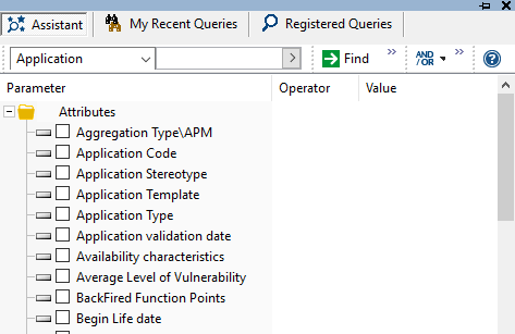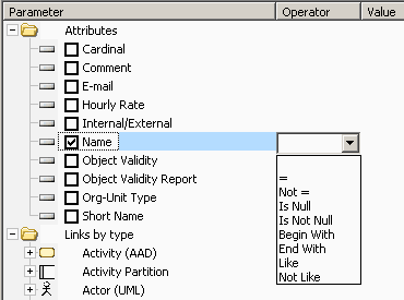 The Parameters column contains the names of the query parameters (characteristics, links, associated objects). Check boxes enable indication of the parameters that define the query.