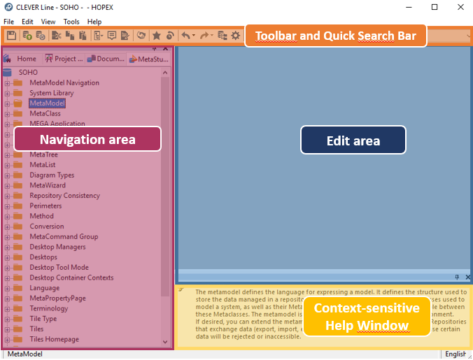 By default, the HOPEX Customizing desktop (Windows Front-End) includes the following elements: