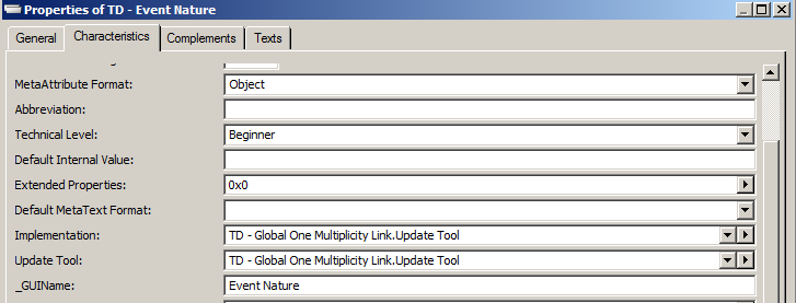 1. Open the Characteristics property page of the TagguedValue object, in the Implementation and UpdateTool fields, connect the ~mBKk9WGUTbQP[TD - Direct Relation UpdateTool] macro;