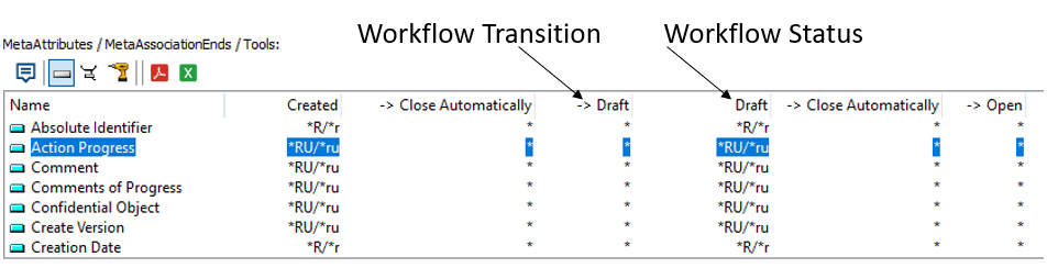 • Values of permissions in upper-case, for example "RU" concern workflow participants.