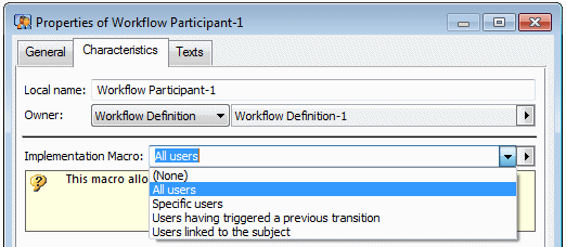 HOPEX supplies different macros enabling definition of the set of persons likely to trigger workflow transitions.