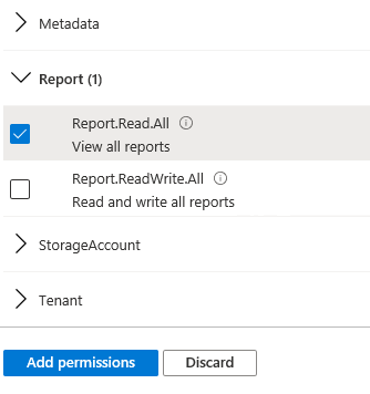 c) Select the required permissions: in Report, select Report.Read.All permissions