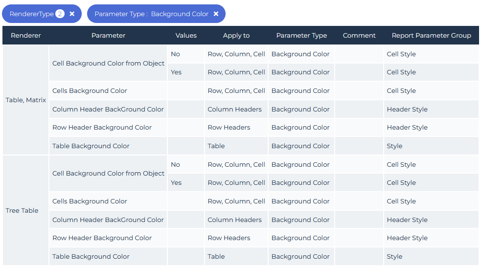 To help you with the parameters available to customize a report according to its renderer type, you can use the Report Style Parameters report template.