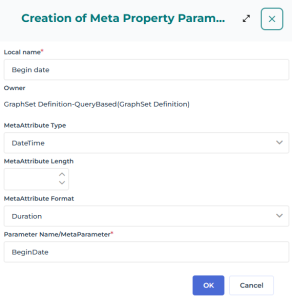 Example: MetaAttribute type "DateTime", MetaAttribute Format "Duration", Parameter Name "BeginDate