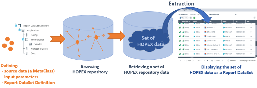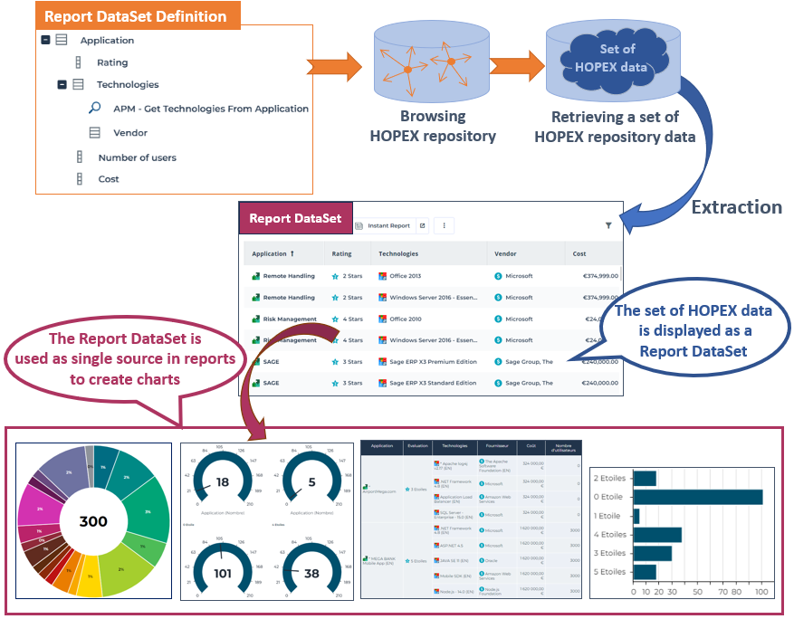 A Report DataSet enables to extract HOPEX raw data and show it in tabular form. With this data the end-user can create reports that use tabular data (e.g.: pie-chart, set of gauges, table, bar-chart, matrix) without needed to enter any code.