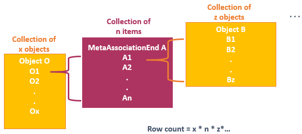 Rows are produced by multiplication of the object count of each MetaAssociationEnd.