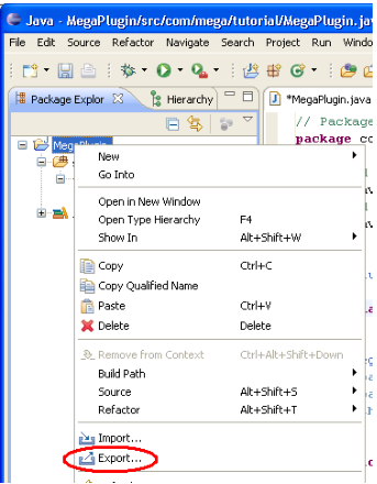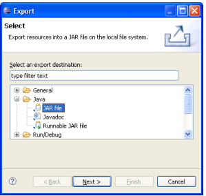 Compilation of the Java component in the form of a JAR file is via the "Export" menu of the Java project: